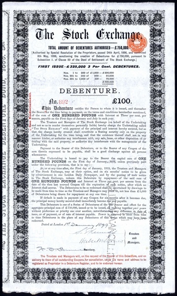 The Stock Exchange, 3% debenture, first series, £100, [1899], no.892, of only 750 issued, large format, ornate border, black, perforated CANCELLED, good very fine and rare.