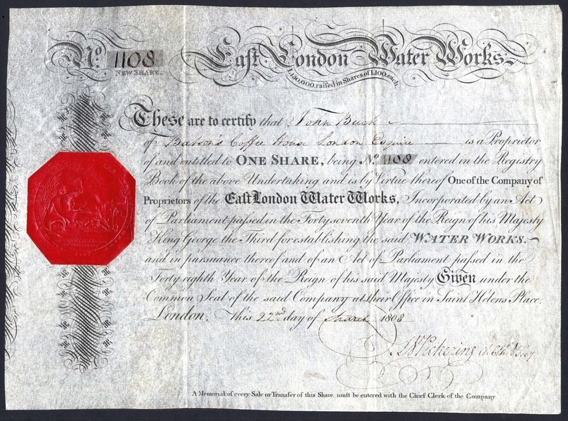 East London Water Works, one new share, London 180[8], no.1108, black printing, on vellum, red waxed paper seal, very fine.