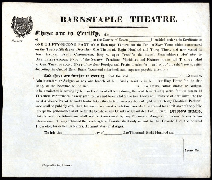 Barnstaple Theatre, an unissued certificate for one 32nd part or share, 1833, arms at top left, black, on vellum, about extremely fine. [R9]