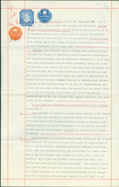 Charlie Chester Productions Limited, typewritten indenture representing a legal agreement between Charlie Chester and his company, inter alia about the transfer of copyrights, performing and reproduction rights for literary dramatic musical or artistic work to the company as well as an annual payment of £1,250, [1955], handsigned by Charlie Chester as Director, 4 pages, three embossed revenue stamps, embossed company seal. Charlie Chester (1914-1997) was an English comedian and TV and radio presenter. He was broadcasting almost continuously from the 1940s to the 1990s, mainly for the BBC. Amongst many other shows he became well known for "The Charlie Chester Show" (a prior radio show adapted for television in 1949) and "Charlie Chester On Laughter Service" (a music and comedy show). Folded 3 times (to "pocket size"), otherwise extremely fine.