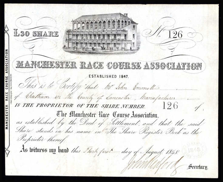 Manchester Race Course Association, £30 share, 1848, no.126, attractive vignette of the grandstand, black, good very fine. [R9]