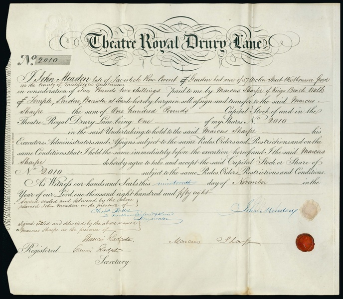 Theatre Royal Drury Lane, transfer certificate for 1 share, 18[58], no.2010, two small wax seals at bottom right, folded, two cutouts at left margin, otherwise very fine.