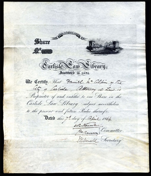 Carlisle Law Library, certificate for 1 share, 18[64], number somewhat feint, black printing on vellum, on the 1830's stock, vignette of Carlisle City walls, very fine and rare. [R10]