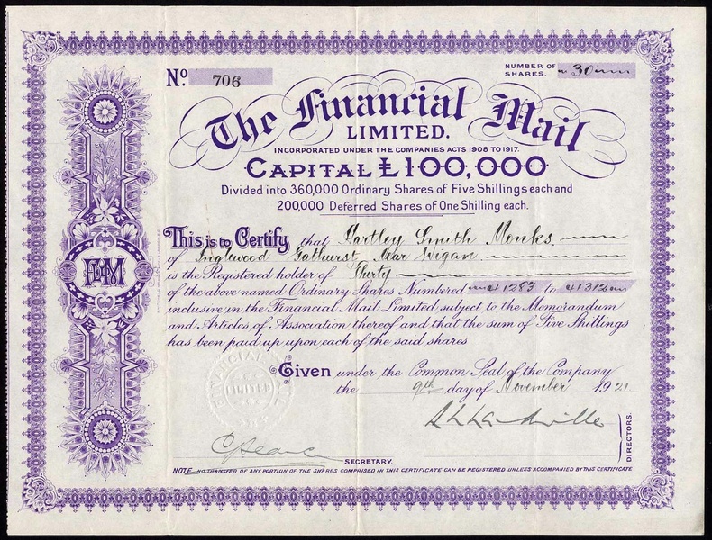 Financial Mail Ltd., 5 shilling ordinary shares, 19(21), signed by Alexis Mandeville as director, ornate border, mauve. The company issued a financial newspaper, pushing shares in which the Mandeville brothers, Alexis, Henry and Walter had an interest. The shares were sold through their Financial Mail and Exchange company in which the public were duped into investing. They all speculated wildly and at the time of this scandal they were all undischarged bankrupts living a life of luxury. It was one of Scotland Yard's highest profile cases of fraud for which they were all sentenced to 6 years in prison. Very fine and rare.