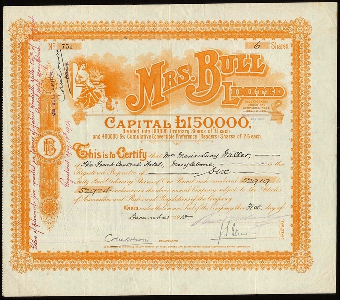 Mrs.Bull Ltd., £1 ordinary shares, fully paid, 19(10), facsimile signature of Horatio Bottomley as director, patriotic vignette of 'Mrs Bull' sitting by fire draped with a Union Jack, orange. A 'sister' magazine to Bottomley's patriotic paper "John Bull" and very scarce. Horatio Bottomley, 1860 - 1933, was a journalist, newspaper proprietor, financier and swindler. Very active during WWI with his newspaper and also his Victory Bond Club for which he was imprisoned in 1918. Died in relative poverty.