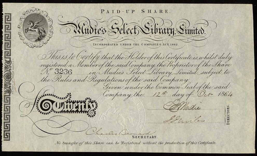 (x) Mudie Select Library Ltd, £20 share, 1864, #3236, founders share with the original signature of Charles E. Mudie, black, EF.