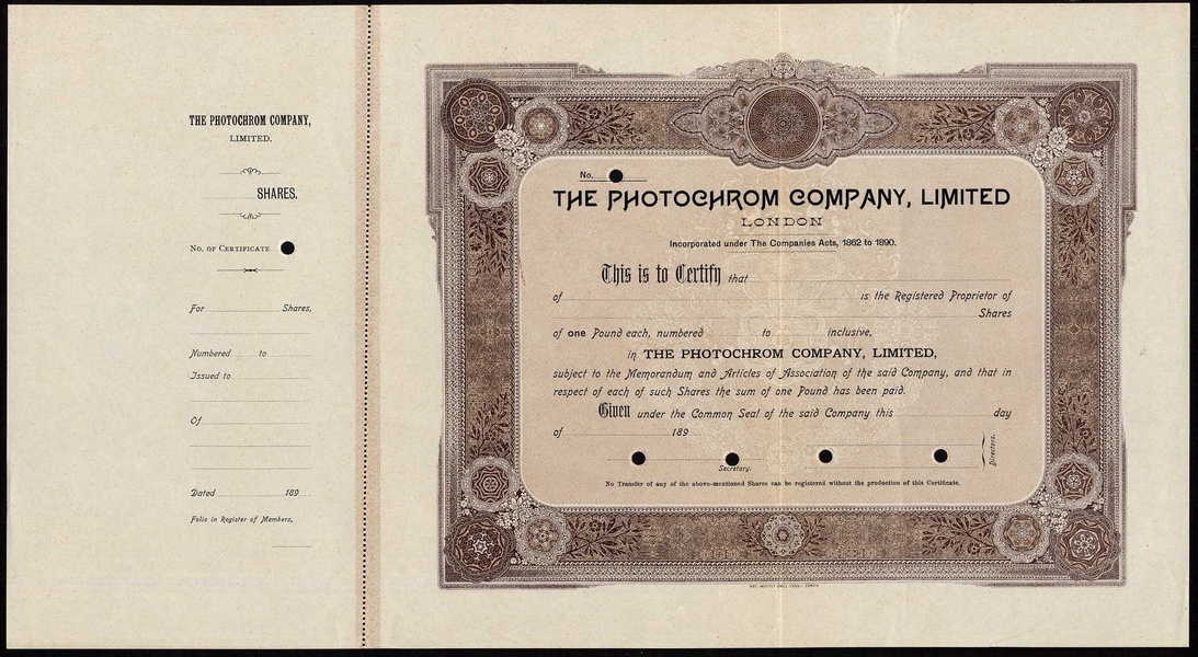 Photochrom Co. Ltd., London un-issued or most likely a specimen certificate for £1 shares, 189[-], hole punched through number and signature strips, beautiful ornate border and underprint, brown and black, printed by Fussli in Zurich, EF.