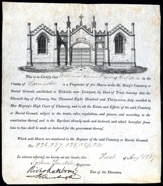 St.Mary's Cemetery, certificate for 5 shares, [1837], no.326-330, lovely vignette of Gothic style entrance gates, black, on vellum, slight toning but very fine and rare. [R10]