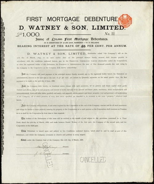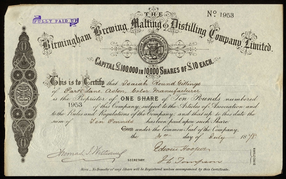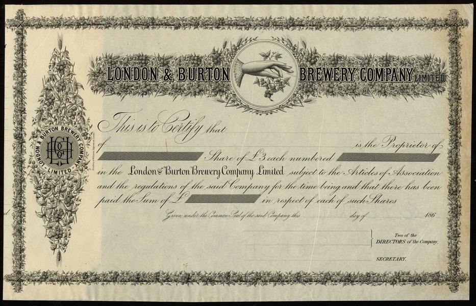 A small group of Brewery certificates comprising London & Burton Brewery Co. Ltd., specimen certificate for £3 shares, 186-, female hand amd hops in centre, black, with counterfoil. The brwery industry in Burton upon Trent gave rise to the expression 'gone for a Burton'. Birmingham Brewing Malting & Distilling Co. Ltd., £10 share, 18[78], 3 examples, attractive vignette, black, and D.Watney & Son Ltd., £1000 debentures, 1888, large format, black, perforated cancelled, only 70 issued, generally very fine. (5)