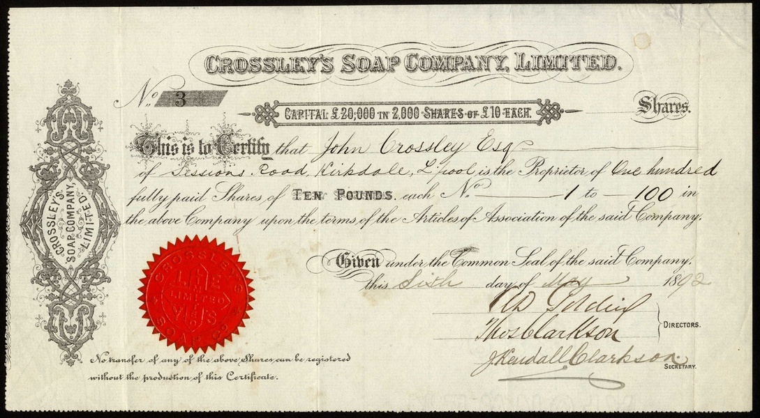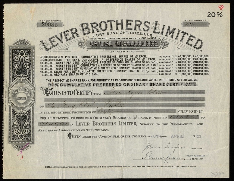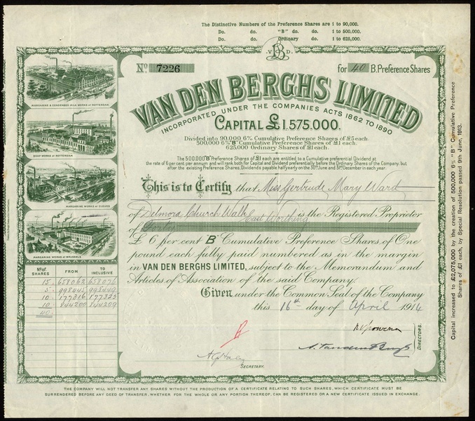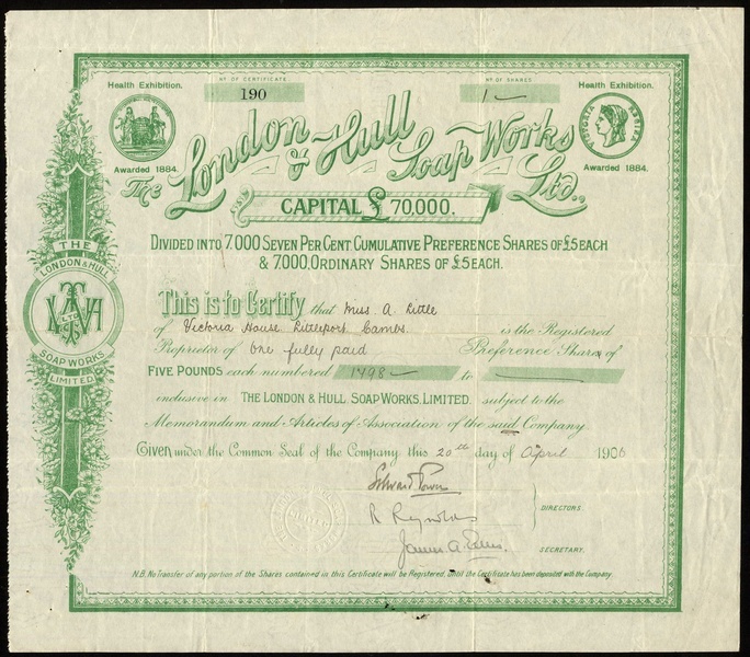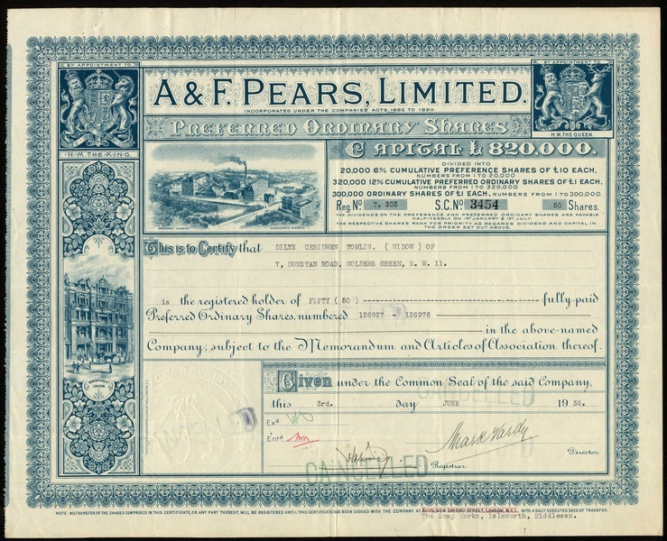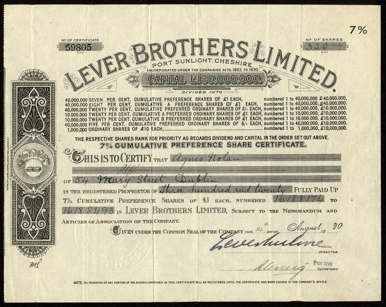 A nice group of British Soap Companies, comprising; Crossley's Soap Co. Ltd., £10 shares, 18[92]; London & Hull Soap Works Ltd., £5 preference shares, 190[6]; Van Den Berghs Ltd., cumulative pref. shares, 191[4] (2); A&F Pears Ltd., preferred ordinary shares, 19[35], 19[50] and 19[51], and, Lever Brothers Ltd., 20% cumulative pref. ordinary shares, 19[23], and 7% cumulative pref. shares, 19[20] and 19[24], generally very fine. (10)