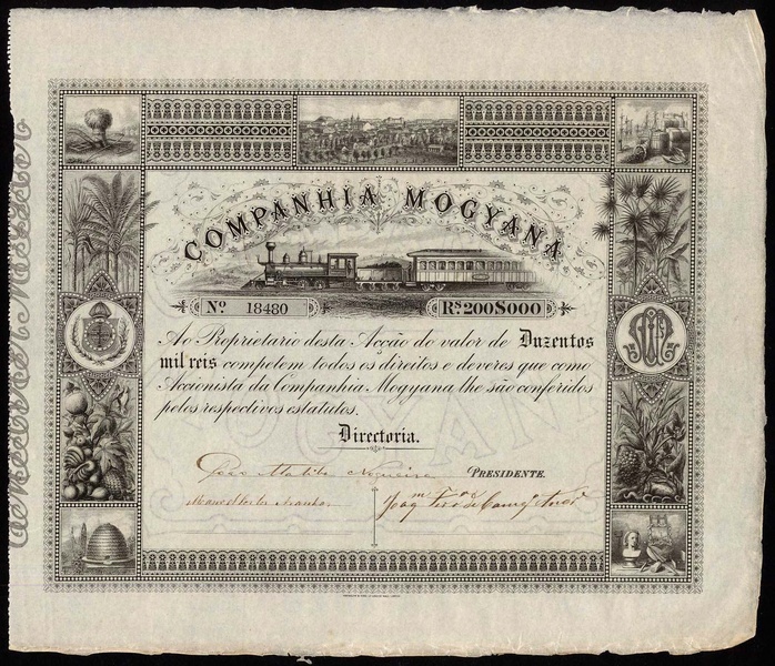 Brazil: Companhia Mogyana, certificate for 200,000 reis, not dated, circa 1875, no.18480, a beautiful piece with vignettes of steam train, city of Campinas, and agricultural and industrial scenes, printed by Waterlow & Sons, black, AEF and scarce.