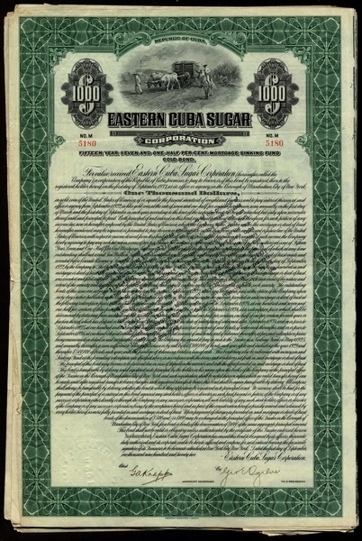 Cuba: Eastern Cuba Sugar Corporation, 15-Year 7½% Mortgage Gold Loan, 1922, a group of 19 bonds for $1000, cane fields and loaded wagon with oxen, green and black, with coupons, a few with edge tears, F-VF. (19)