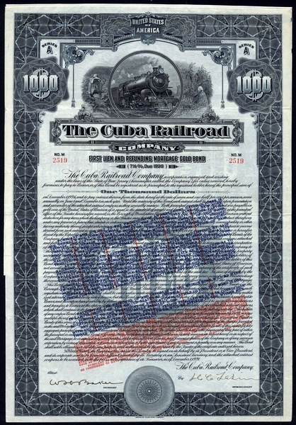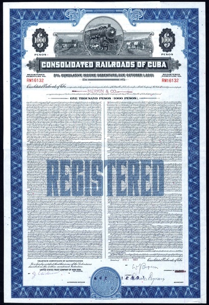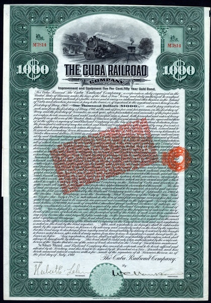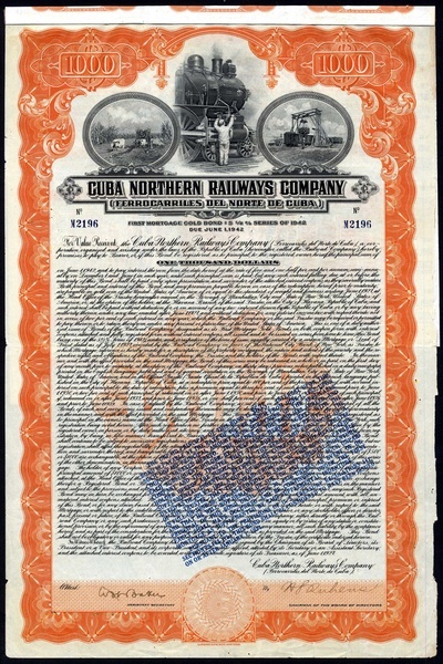 Cuba Railroad Co., Improvement and Equipment 5% 50-Year bond, $1000, 1910, no.M3814, signed by W.C.Van Horne as President, steam train at top green, with coupons; together with First Lien and Refunding Mortgage Gold Bond, 1921, $1000, no.2519, steam train at top, slate blue, with coupons; Cuba Northern Railway Co., First Mortgage Gold Bond, $1000, 1927, no.M2196, steam train, orange and black, with coupons, and Consolidated Railroads of Cuba, 3% Cumulative Income debentures, $1000, 1957 and $5000, 1953, the third has small edge tears otherwise about very fine and better. (5)