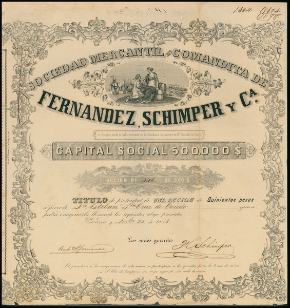 Sociedad Mercantil en Comandita de Fernandez, Schimper y Ca., 500 pesos share, Havana, 18[58], no.346, black, vignette with female allegories, superb border. Old Cuban trading company, most probably also active in the financing business. Vertical fold repaired with tape, edge damage, some minor damage at lower margin, original signatures, fine to very fine.