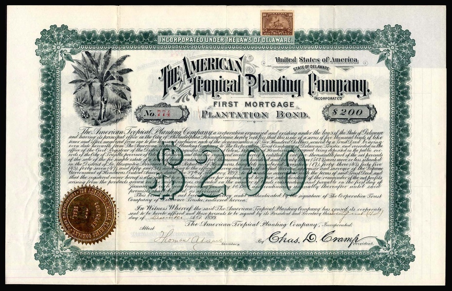 Honduras: American Tropical Planting Company (DE), First Mortgage plantation bond, $200, 1899, no. 774, vignette of banana trees top left, green and black, gold seal, with coupons. It would appear that the company was offering parcels of land in this region which historically has been tried before by Gregor MacGregor but without success. The region is one of the most inhospitable in the world so it is no surprise. The Delaware Charter was repealed in 1903. Good very fine