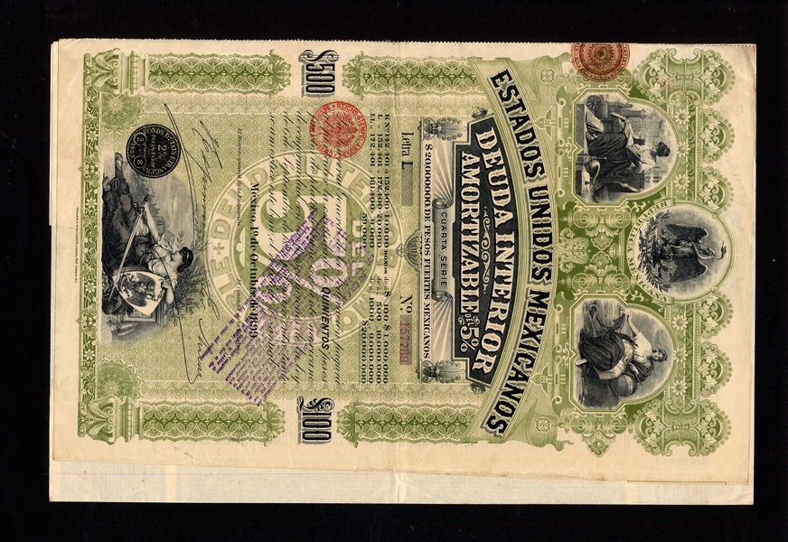 Mexico: 5% Interior Loan, 3rd series, bond for $1000/£200, 1898, no.136263, and 4th series, bond for $500/£100, both with 4 vignettes of allegorical figures and Mexican eagle, mauve and green respectively, printed by Waterlow, with talon and receipt for unpaid coupons, the first with small tear at left edge, VF, the second better. (2)