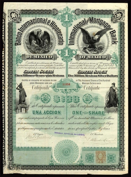 Mexico: Banco Internacional é Hipotecario de México, 1 share of 100 pesos, [1890], 2 examples, no.11354 and no.11357, very attractive piece in both Spanish and English, Mexican and American eagles at top, allegorical female and native American at either side, green and black, printed by ABNCo., with coupons, split at folds at left edge, about very fine and rare (2)