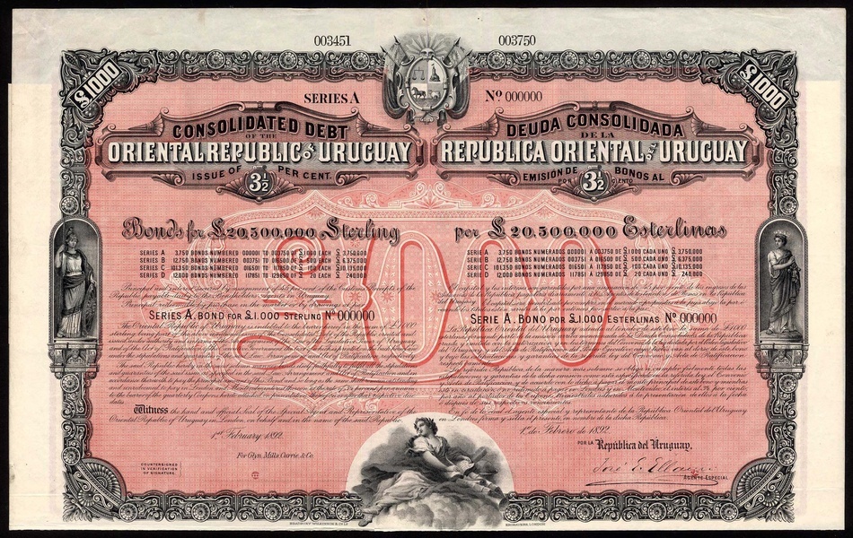 Oriental Republic of Uruguay, 1892 3½% Consolidated Debt, a specimen bond for £1000 from the Bradbury, Wilkinson & Co. archive, large format piece with vignettes of coat of arms and allegorical figures, text in English and Spanish, red and black, with coupons, small hole cancels over signature and number area, GVF and a rare denomination [R12*]