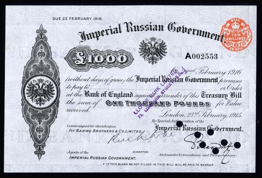 Imperial Russian Government, Short Term Treasury Bill, 23rd February 1915, £1000, no.A002553, redeemable 22nd February 1916, cvoat of arms at top, and in scrollwork at left, black, red embossed revenue stamp, hole cancelled, almost extremely fine.