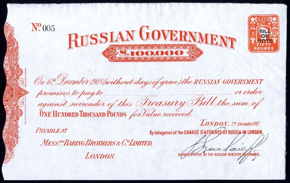 Russian Government, Short Term Treasury Bill, 7th December 1917, £100,000, no.005, payable at Baring Brothers in London, redeemable 6th December 1918, scrollwork at left, red, red embossed revenue stamp, NOT cancelled, extremely fine and rare.