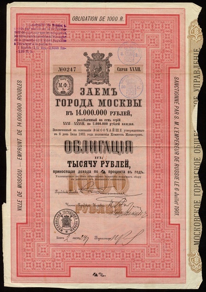 Russia: A selection of City Loans, comprising St.Petersburg, 1891, 1000 roubles, no.02624; Moscow 1901, series XXXII, 1000 roubles, no.0247, lacking coupons; Windau, 100 roubles, 1908, no.6266, stained; Moscow 1912, £500, no.00931, and others including Sebastopol, Tiflis and Odessa, F-VF. (13)