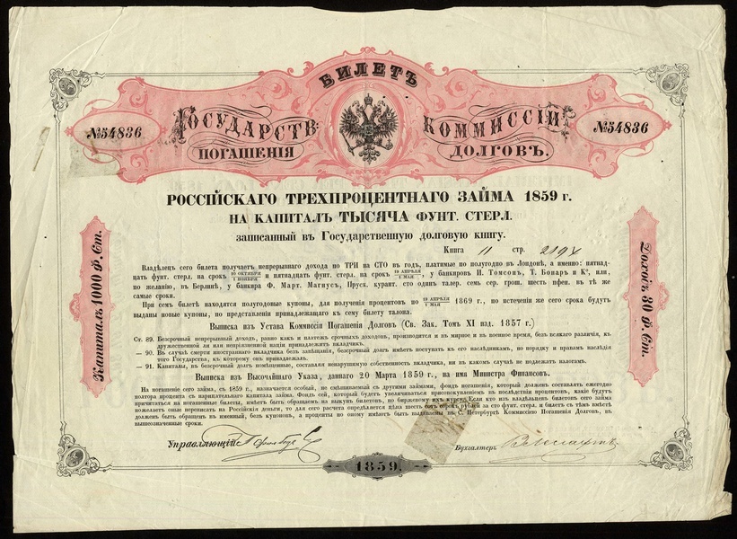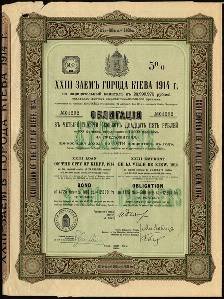 Russia: City of Kieff, 5% 23rd Loan, 1914, bond for £500, coat of arms at top, ornate border, brown, green & black, with coupons, edge tears at left and top edges otherwise very fine and rare; together with Imperial Russian 3% Loan of 1859, bond for £1000, Russian eagle at top, black and pink, English on reverse, lacks coupons or talon, glue residue on the reverse otherwise very fine and rare high denomination, together with other Russian bonds (16) including Soc. du Credit Immobilier de la Ville d'Odessa and Commercial Bank of Siberia, mainly fine to very fine, some better. (18)