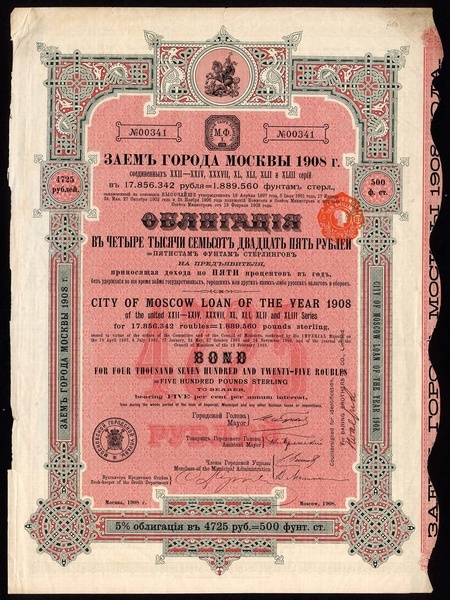 Russia: City of Moscow, 1908 5% Loan, bond for £500 or 4725 roubles, no.00341, of only 400 issued, George and dragon at top, ornate border, green and pink, with coupons, a couple of small edge splits, GVF and scarce.