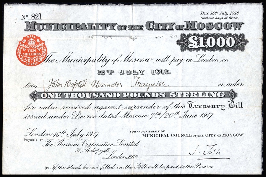 Russia: City of Moscow, Short Term Treasury Bill, 16th June 1917, £1000, no.821, redeemebale 16th July 1918, black printing, red embossed revenue stamp, NOT cancelled, very fine and rare.