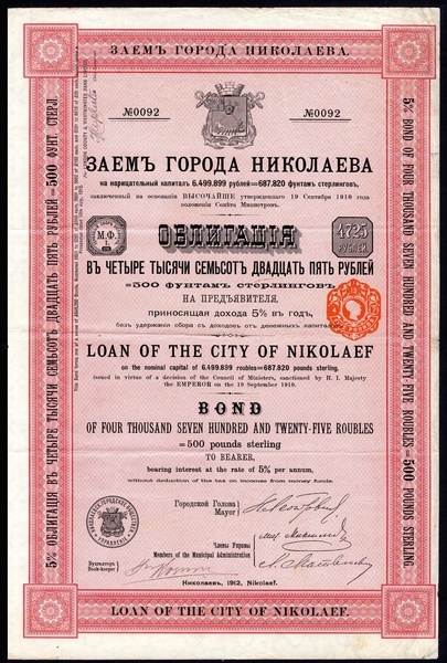 Russia: City of Nikolaef, 5% Loan, 1912, a £500 bond, no.0092, of only 261 issued, ornate border, red and black, arms at top, with coupons, about very fine and scarce.
