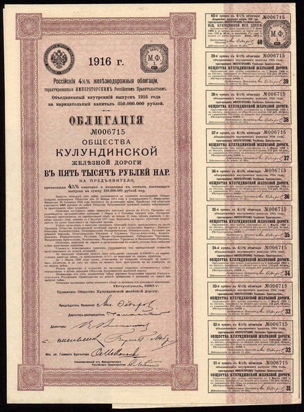 Russia: Kulundin Railway, 4½% Loan, 1916, bond for 5000 roubles, no.6715, ornate border, mauve and black, with coupons, EF.