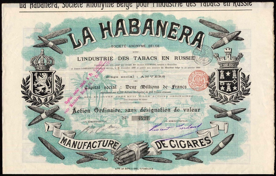 Russia: La Habanera, Societe Anonyme Belge pour L'Industrie des Tabacs en Russie, 250 franc share, Bruxelles 1900, no.4527, unusual design with coats of arms and numerous cigars around border, brown and blue, with coupons, AEF.