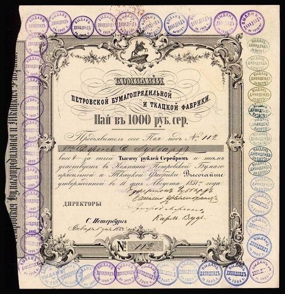 Russia: St.Petersburg Cotton Mill Co., certificate for one share of 1000 roubles, 1851, no.112, ornate border, black, handstamps on front and back showing dividends paid from 1852 through to 1915/16, endorsement on reverse noting the ownership of the share by the Anglo Russian Cotton factories Ltd., extremely fine and rare. Extremely early for a Russian Corporation. [R8]