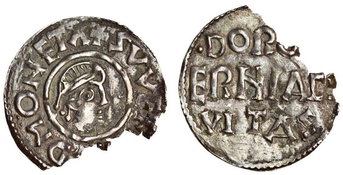 Kent, regal anonymous issues (c.822-23), Penny, 1.22g., Canterbury, Swefherd, +SVVEF[..]D MONETA, diademed head right, rev. .DOR[OB]/ERNIA CI/VITAS, in three lines (Naismith C55.2e - this coin; N.221/2; S.978), large chip, c.70% complete, small crack associated with break, very fine, extremely rare