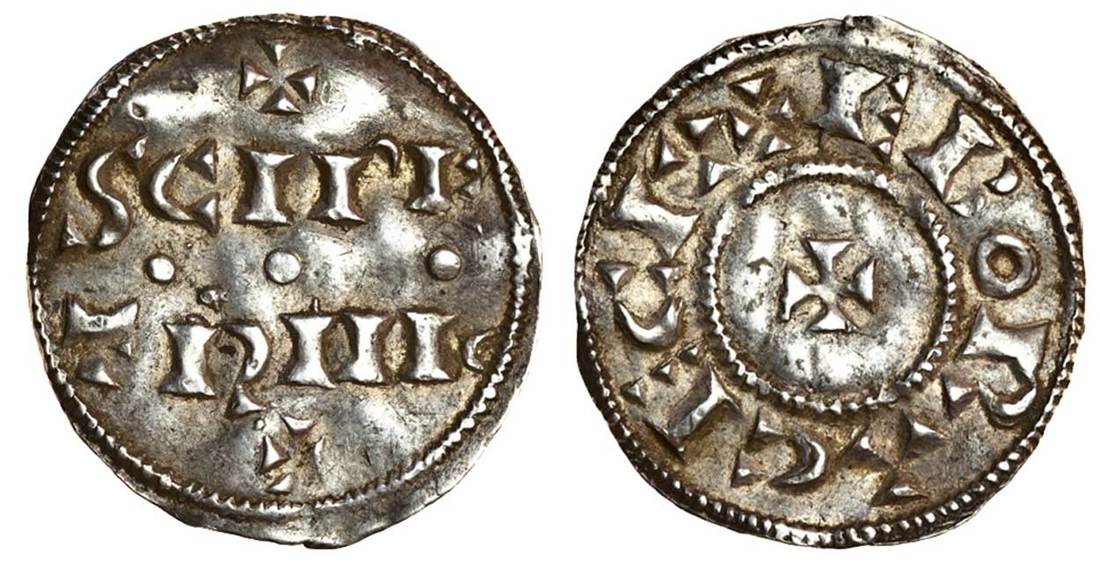 Viking Kingdom of York, c.895-920, St Peter, phase I, ‘Swordless,’ c.905-10, Penny, 1.34g., SC PE/TRI II, divided by three pellets, cross above and below, rev. +EBORACE CIV, small cross (N.551; S.1006), lightly crimped, good very fine, a good example of this issue