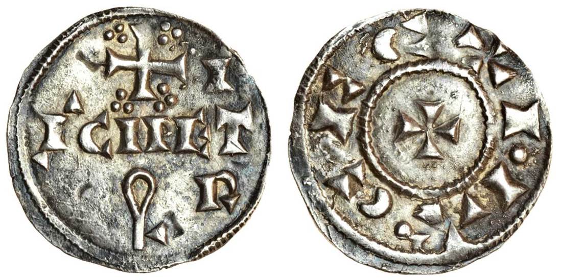 Viking Kingdom of York, c.895-920, St Peter, late phase I, ‘Swordless,’ c.905-10, Penny, 1.19g., SCI PETRI, in single line with I above and R below the T, large cross above, trefoil in each angle, key below, rev. +I.IA CFC, small cross (N.551 var.; S.1006 var.), good very fine, an extremely rare variety of the St Peter coinage of York