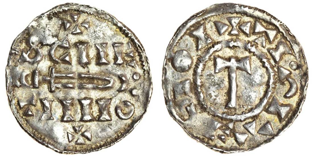 Viking Kingdom of York, c.895-920, St Peter, phase III, Penny, 1.34g., Sword/Hammer type II, c.921-27, SCII E/TIIIO, divided by sword right, cross above and below, crescent between pellets by sword tip, rev. blundered legend, solid ‘T’ shaped Thor’s mallet within inner-circle (N.557; S.1016), flan metal flaw at top left of obverse, even pleasing tone, good very fine, rare