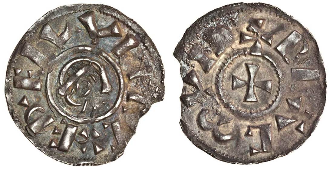 Wessex, Aethelwulf (839-58), early phase, 839-c.844, Penny, 1.12g., Rochester, Beagmund, EÐELVVLF REX, crude head right within inner circle, rev. +BEAGMVND, cross within inner-circle (Naismith R19.1b – this coin; SCBI 20,705 – this coin; N.592, 594; S.1042), chipped between three and five o’clock, very fine