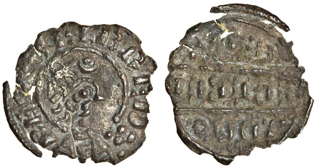 Wessex, Alfred the Great (871-99), lunettes coinage, 871-c.876/7, Penny, 0.62g., Herebald, +AELBRED-REX, bust right, rev. LDMO/HEREBA/NETA, lunettes A (Lyon and Mackay, 1B; N.625; S.1057), very ragged edges, corroded but key details visible, good fine