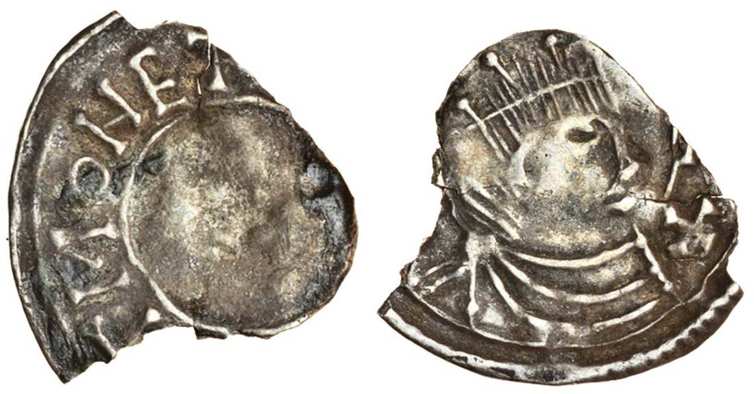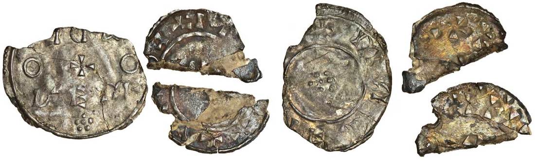 ?Eadred (946-54), Penny, 0.52g., bust crowned, […]X, rev. [.]t MONET[.], (N.713; S.1115), a fragment, with bust, fine, 0.12g., ?Kingdom of York, Hiberno Norse Vikings, Penny, floral type, a small fragment, 1.05g., Eadgar, time of, contemporary imitation, circumscription cross type, blundered legends, rev. cross with pellet at end of each arm (cf, N.748; cf. .1134), complete, nearly very fine , Eadred, time of (3), 0.61g., 0.39g., 0.37g., fragments (3), contemporary forgeries, fair to fine (6)