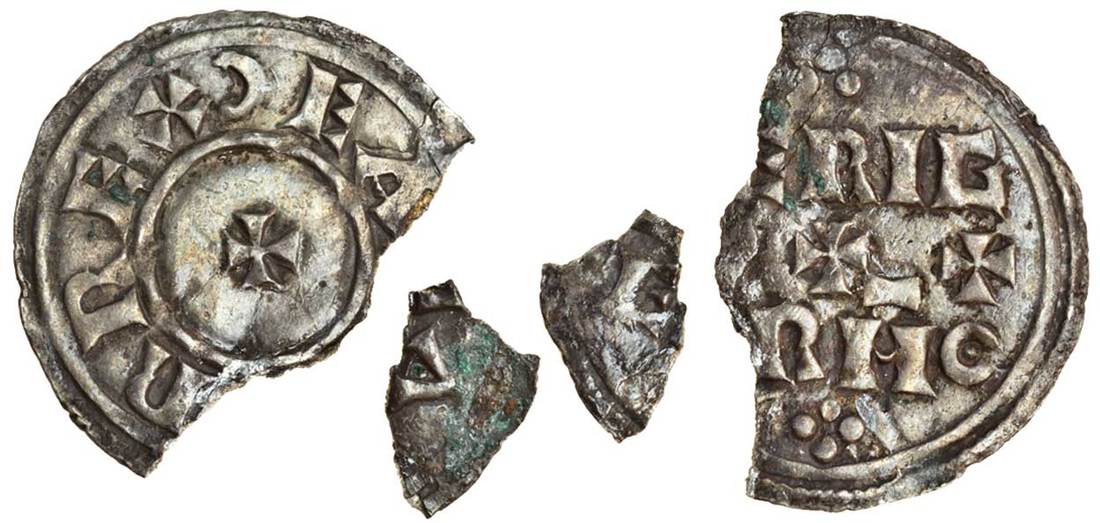 Eadgar (959-75), Penny (6), 0.71g., cut half, HT NE V, ?Bernferth (N.741; S.1129), 0.73g., broken half, HR2, Aelfsige (N.745; S.1130), 0.96g., broken, HT NE V, Heriger (N.741; S.1129), 0.83g., North Western, HR3, broken, Thermod (N.757; S.1137), 0.57g., broken half, HT1 NE V, Ingolf, moneyer not in North for this, noted for reform type for Newark, 0.67g., fragment, three line type, Tamworth, Deorulf, rev. DEOR/OT+E[.]/[.]LF[.], (N.757; S.1132), fair-fine, one or two better, some very rare types (6)