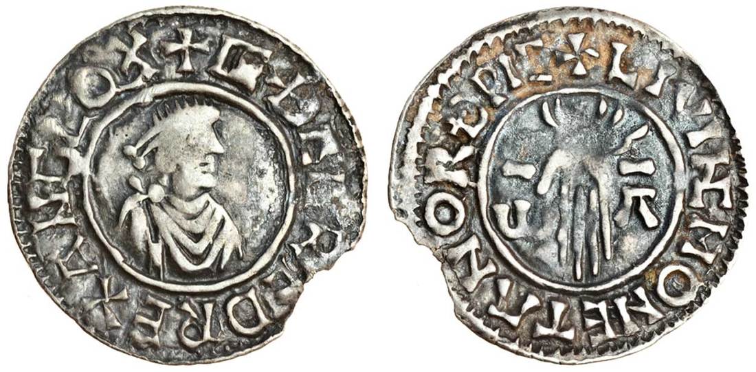 Lifinc, diademed bust right, rev. +LIVINC MONETA NORĐPIC, Hand of Providence issuing from clouds dividing W A (N766, S1144), chipped from 4-5 o’clock with some deposits in the reverse legend, good fine, very rare.