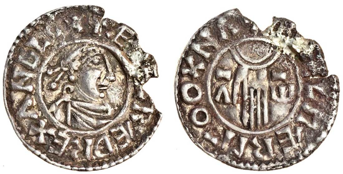 Aethelred II (978-1016), Penny, 1.38g, First Hand type, York, Frostulf, diademed bust right, rev. +CROSTVFE M-O E[ ]R, Hand of Providence issuing from clouds dividing A W, (N766; S1144) and Penny, 0.85g, First Hand type, Oxford, ÆthelmÆr, diademed bust right, rev. +ÆĐELMÆR M-O OXNA, Hand of Providence issuing from clouds dividing A W (N766; S1144), both chipped, the first slightly porous, fine or better, the second previously mounted with traces of solder, otherwise very fine. (2)