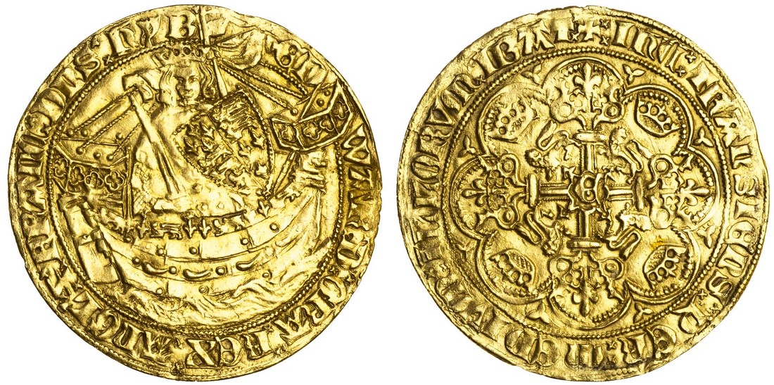 Edward III (1327-77), Noble, 8.07g, third coinage, third period, mm. -/cross pattée, ed/war d’ gra’ rex angl’ z franc dns hyb, double saltire stops, king standing, facing with sword and shield in ship, rev. + ih’c transiens per medivm illorvm ibat, double saltire stops, ornate cross, closed e at centre, lion and crown in each angle within tressure, trefoils in spandrels (N.1110; S.1481; Schneider -; Stewartby II; Potter II, letters C), a full coin, lightly cleaned, otherwise very fine to good very fine, very rare