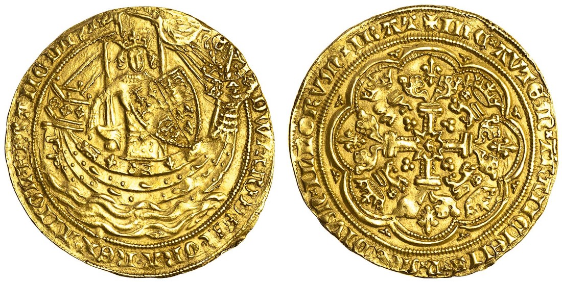 Edward III (1327-77), Noble, 7.70g, fourth coinage, Pre-Treaty period, series Gb/c mule, mm. -/incurved cross pattée, e/dward dei gra rex aiigl z fraiic dhyb, king standing, facing with sword and shield in ship, rev. +: ih’c avtem traiicieiis p medivm illorvm ibat, ornate cross, small e at centre, trefoil and lion in each angle, one with a lis, alternate lis and crowns in each of eight-arc double tressure, trefoils in spandrels (N.1180; S.1490; Schneider 47; Stewartby Gb/c), slightly double struck in obverse legend, very fine, rare