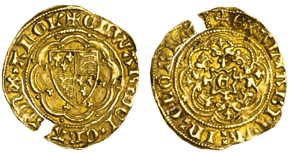 Edward III (1327-77), Quarter-Noble, 1.82g, fourth coinage, Transitional Treaty period, series A2/1 mule, mm. incurved cross pattée, +edwar dei gra[ ] rex angl’, royal arms on shield, rev. + exaltabitvr in gloria, floriate cross, e at centre, lion in each angle, double tressure, trefoils in spandrels (N.1224; S.1501; Schneider -; Stewartby A2/1), chipped and cracked along the inner circle, otherwise very fine, rare with E in centre of reverse