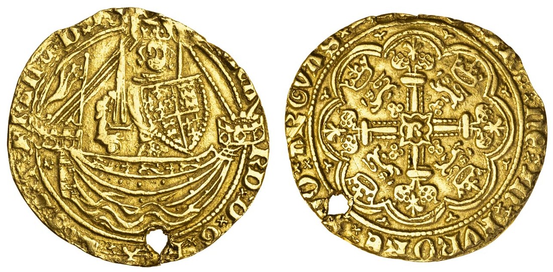 Richard II (1377-99), Calais, Half-Noble, type 3c, 3.64g, mm. -/cross pattée, rica/rd’ d’ g’ rex angl’ z franc’ d’ h [ ], saltire stops, king with sword and shield, facing, in ship, flag at stern, saltire behind rudder, rev. [ ]e ne in fvrore tvo argvas [ ], double saltire stops, ornate cross, r in panel at centre, all within tressure, trefoils in spandrels (N.1316; S.1671; Schneider 181/-; Stewartby IIIc), pierced at 6 o'clock, on a small flan, otherwise very fine, an extremely rare denomination for Calais