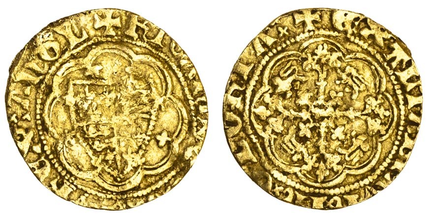 Richard II (1377-99), Quarter-Noble, type 1a, 1.50g, mm. cross pattée, ricard dei gra rex angl, double saltire stops, shield, nothing above, within tressure, trefoils on cusps, rev. exaltabitvr in gloria, double saltire stops, cross fleury, r at centre, all within tressure (N.1317; S.1672; Schneider 125; Stewartby Ia), creased and clipped, nearly fine, rare