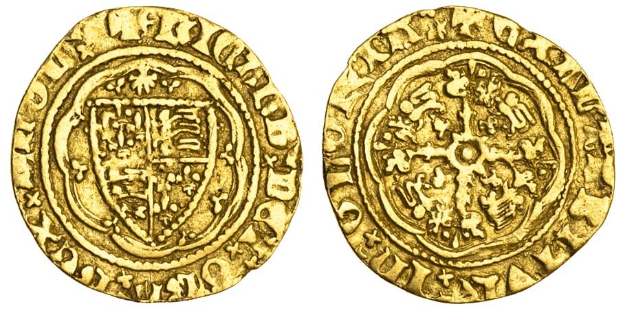 Richard II (1377-99), Quarter-Noble, type 4a, 1.61g, mm. cross pattée, ricard dei gra rex angl , double saltire stops, shield, scallop above, within tressure, trefoils on cusps, rev. exaltabitvr in gloria, double saltire stops, cross fleury, pellet at centre, all within tressure (N.1319; S.1677; Schneider -; Stewartby IVa), on a small flan, almost very fine, very rare
