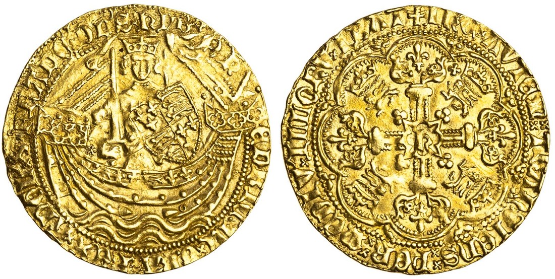 Henry V (1413-22), Noble, type C, 6.93g, mm. -/pierced cross, h/enric’ di’ gra’ rex angl’ z franc’ dn’s hyb’, saltire stops, king with sword and shield facing in ship with broken annulet on hull and mullet by arm, rev. ih’c avtem transiens per mediv’ illorv’ ibat, single/double saltire stops, royal cross within tressure, trefoil, lion and crown in each angle, h in panel at centre, trefoils in spandrels (N.1371; S.1742; Schneider 227; Stewartby C), very fine