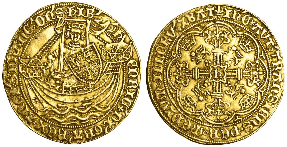 Henry V or VI Noble, type H, 6.85g, mm. -/lis, h/enric’• di’• gra’• rex• angl’• z• franc’• dn’s• hib’, lis before di otherwise trefoil stops, king with sword and shield facing in ship, rev. ih’c avt’ transiens per medivm illorv’ ibat, royal cross within tressure, trefoil, lion and crown in each angle, h in panel at centre, trefoils and one annulet in spandrels (N.1414; S.1799; Schneider -; Stewartby H: Whitton 1a), a pleasing full coin, very fine or better